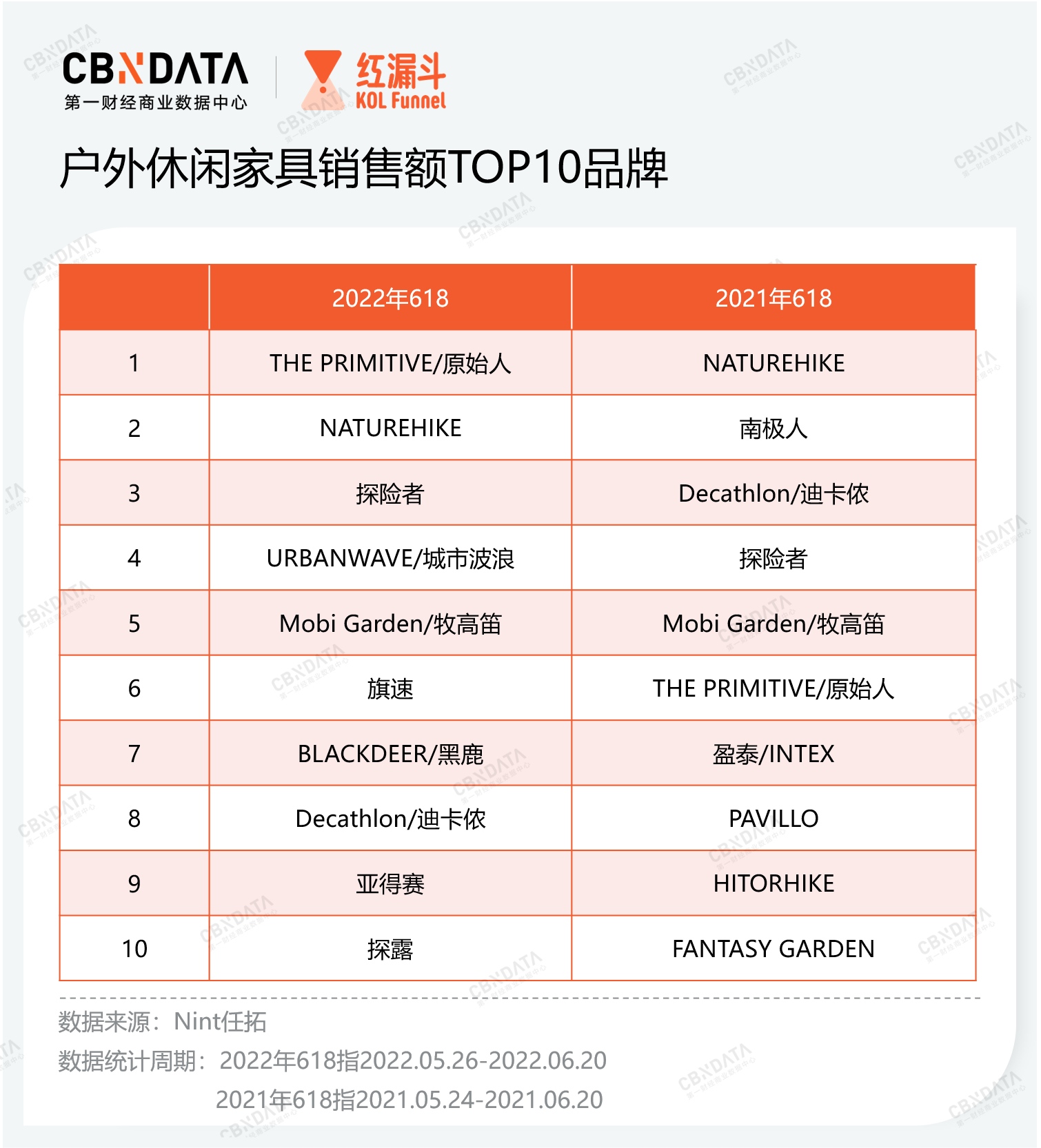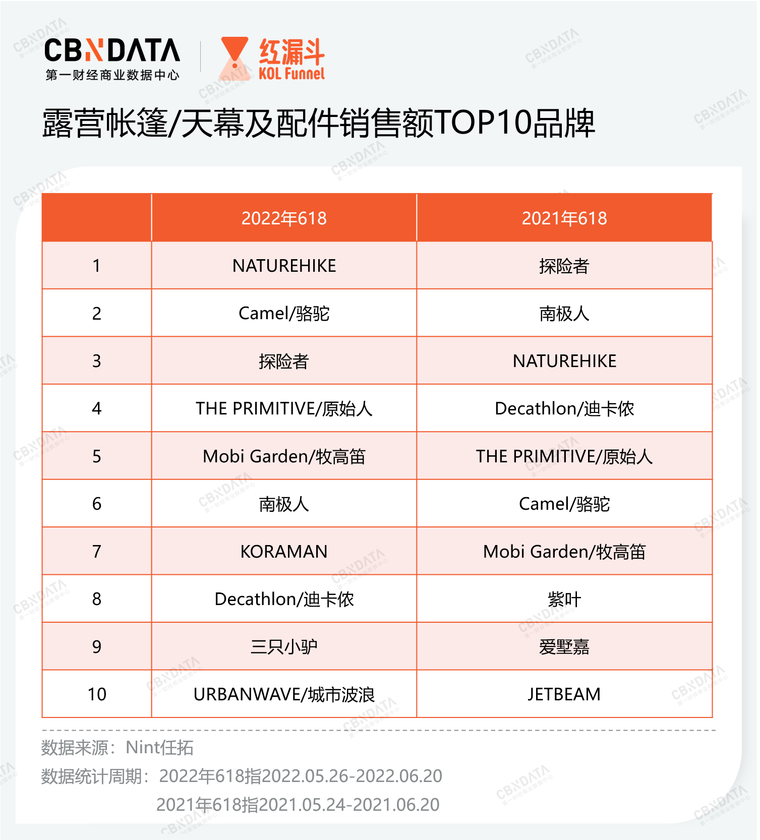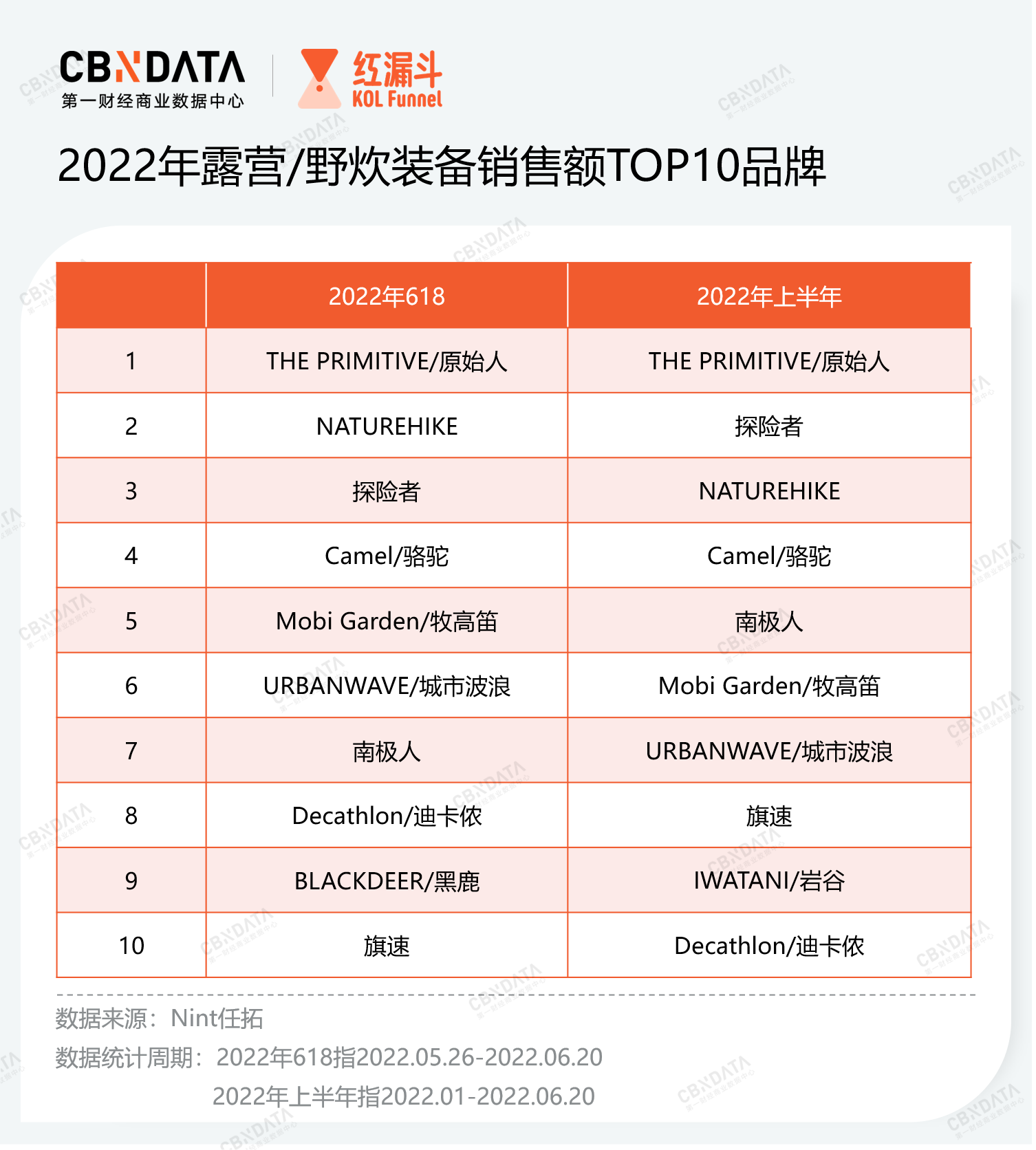 其中,除“炉具/餐具/野餐烧烤用品”的销售额在今年上半年、618期间双双同比下降外,其余三个品类均实现正同比增长。原因可能在于,野餐烧烤用品依赖于野外露营场景,上半年各地疫情反复导致外出受限,而热门的城市露营、公园露营场景无法明火烧烤。不过据Nint任拓数据,户外冷藏箱、保温箱成为该类目单品榜中的新面孔,是相对确定的增长点。