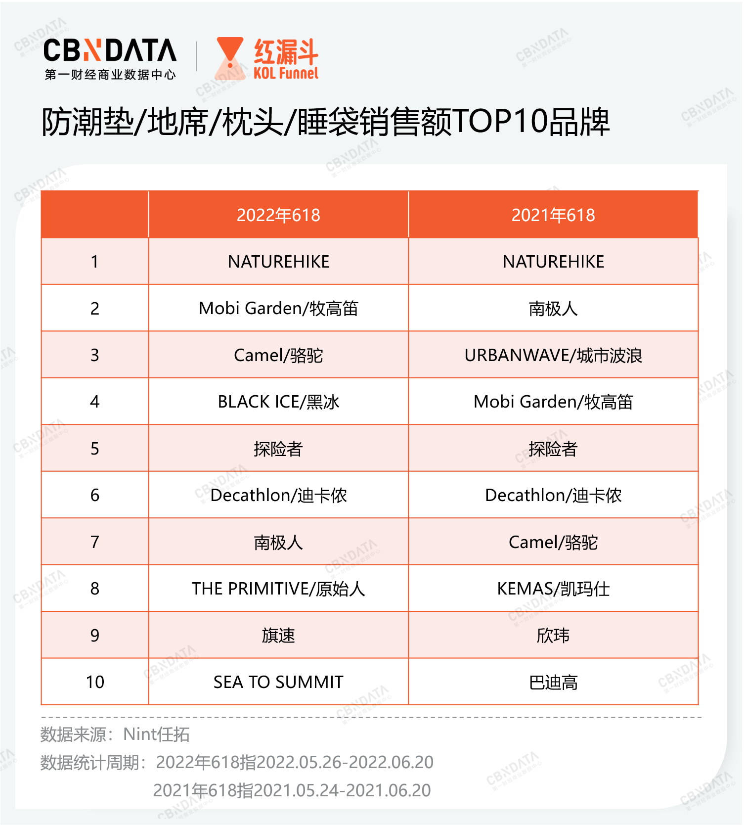 对于“防潮垫/地席/枕头/睡袋”品类,消费者的核心诉求根据产品不同有所差异。购买野餐垫、防潮垫之类单价较低的产品时,消费者更为看重颜值与便携性;购买睡眠类产品时,消费者则更注重专业性及保暖、防潮等核心性能。Nint任拓数据显示,NATUREHIKE(挪客)连续两年618位居销售额榜首。其创始人原本从事户外代工业务,于2010年推出挪客品牌,今年4月该品牌完成近亿元首轮融资。由于品牌的代工背景及在产品研发上的优势,睡袋、气垫等睡眠产品多次夺得天猫单品类销售第一。今年618排名第四的品牌黑冰,由睡袋业务起家,鸭绒及鹅绒系列较受专业户外圈认可,今年618也取得不错的成绩。原因或许在于,专业爱好者趁618大促,反季购买户外保暖睡眠用品。