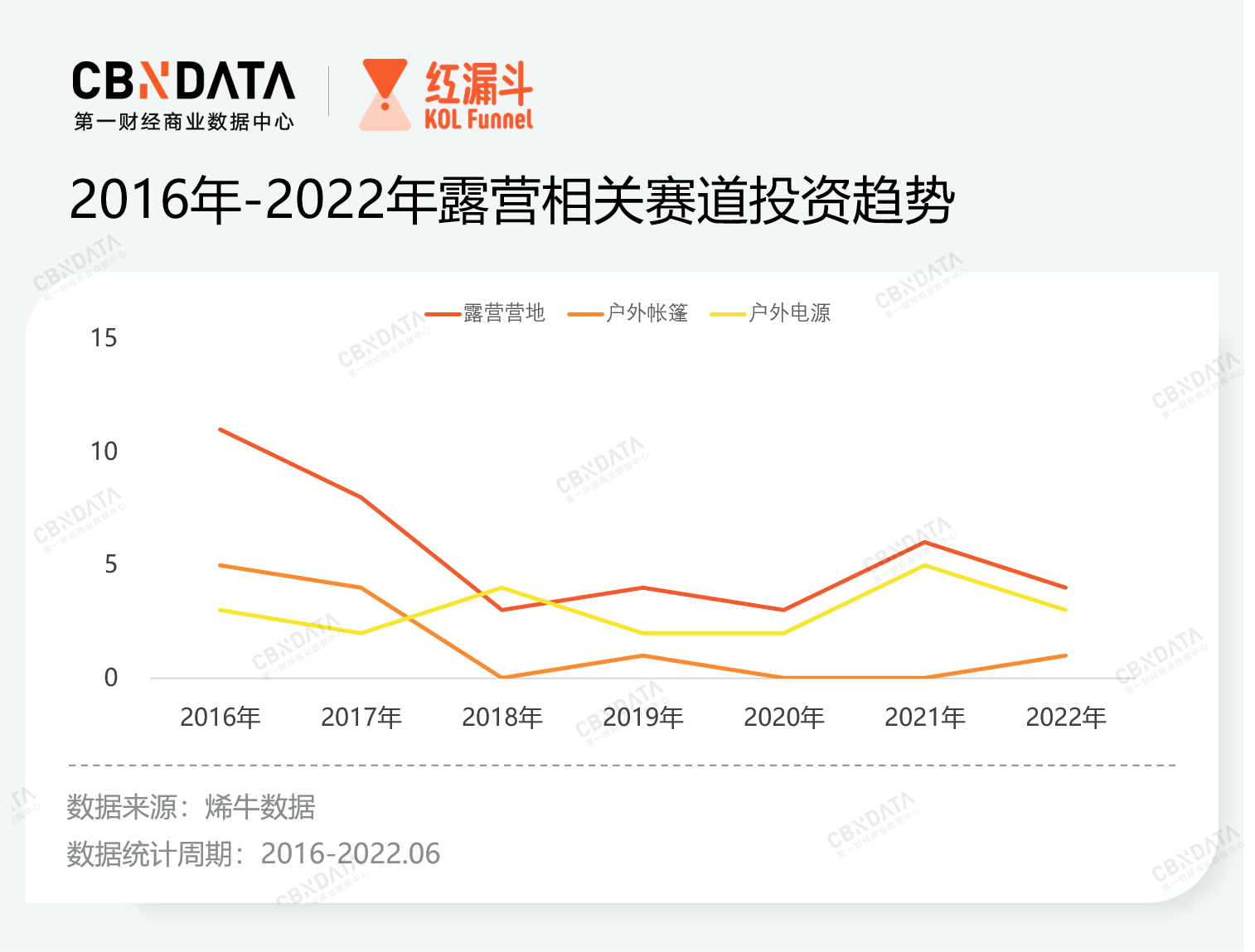 资本市场对露营市场的前景也给予肯定,不过相关投资事件局限于“露营营地”这一偏专业、重资产的赛道,且获投项目在精不在多。如果把范围放大到户外领域,户外帐篷、户外电源近年来获投次数的上升,也在一定程度上与露营等小众项目的走红有关。值得注意的是,烯牛数据显示,2021年之前,获投企业仅有部分业务关联露营且多成立于2015年之前;如今一批专注露营业务的新企业相继完成天使轮融资,为赛道注入新鲜力量。