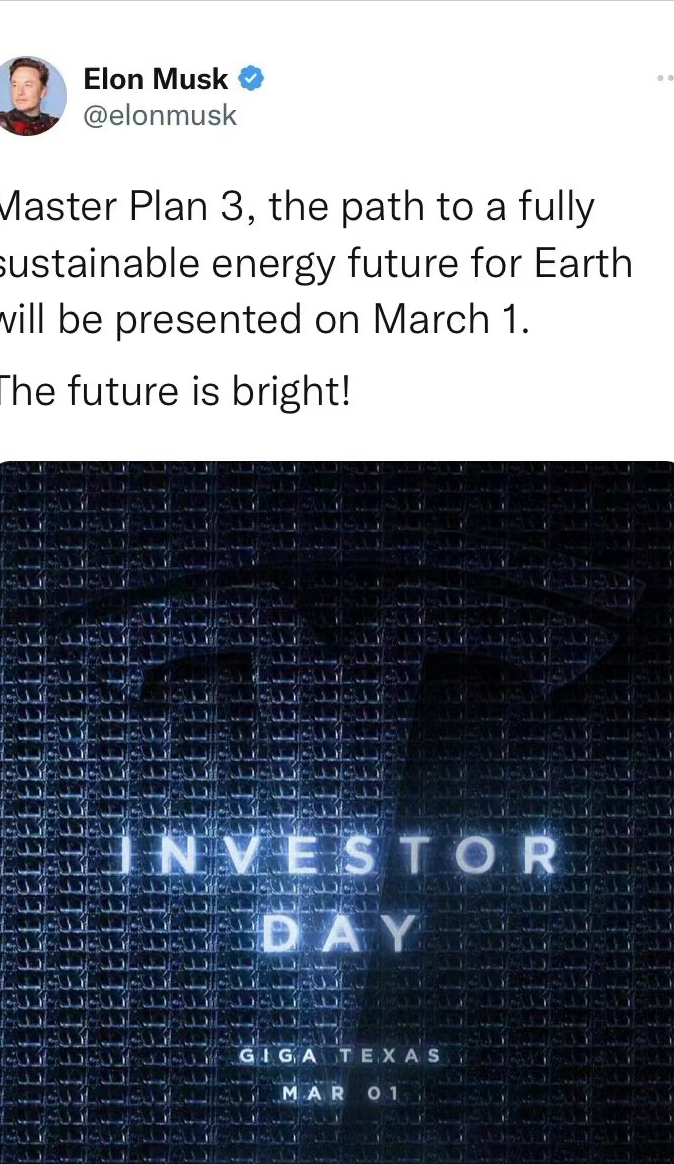 我们知道,在3月1日,特斯拉将举行一场投资者日活动,从预热来看,这次活动特斯拉有新动作。