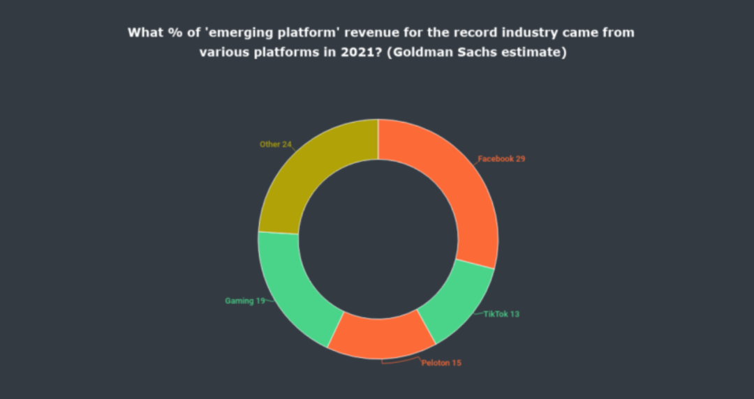 在一周发布的最新版《 Music In The Air》报告显示,2021年,“新兴平台”为录制音乐业务贡献了所有广告支持流媒体收入的30%,而TikTok仅仅只贡献了“新兴平台”收入中的13%。