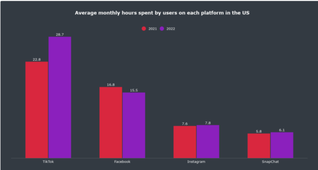 根据 App Annie 的数据,2021 年夏天,美国地区TikTok用户每月在该平台上观看的内容超过24 小时,而YouTube用户每月接近22 小时。而根据 data.ai 通过彭博社提供的数据,现在美国的TikTok用户平均每月花费28.7 小时,同比去年同期增加了大约 6小时,远超第二名Facebook的15.5小时。