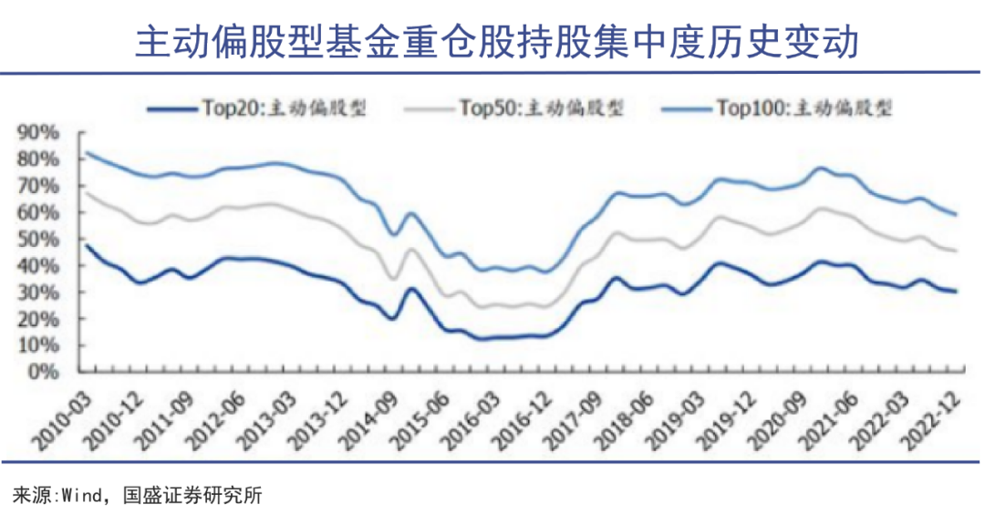 大量的资金集中在头部机构手中,直接导致了基金抱团与股民跟风。2021年时偏股型基金重仓股集中度处于5年来的高位,前100名基金重仓股集中度超过80%,抱团炒股的趋势明显。