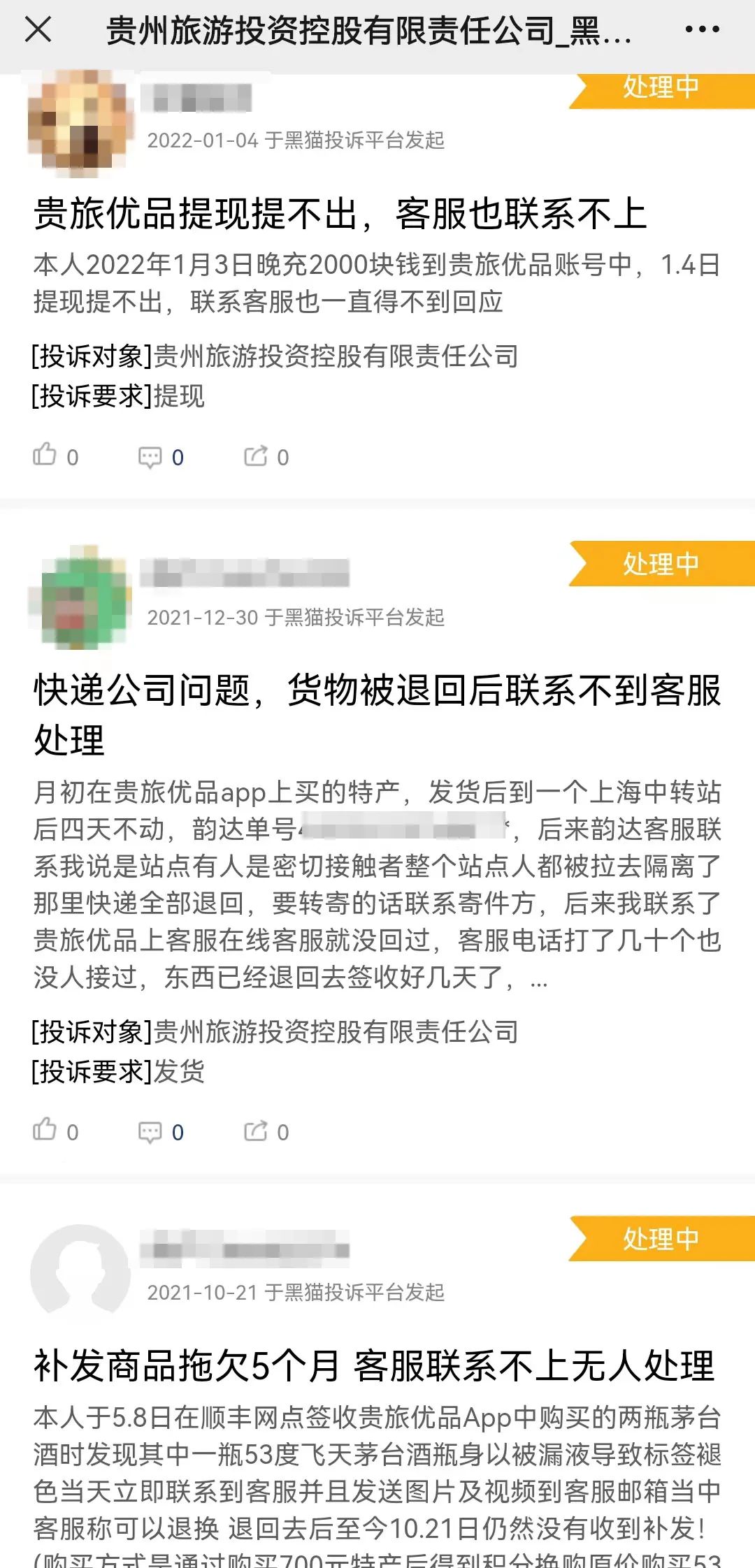 贵阳玉贝商务有限责任公司能实现如此高额利润,因其具有有茅台酒经销权。但闻旅查询人民网领导留言板、黑猫投诉等平台发现,自2021年3月起,关于“贵旅优品”平台无法体现、补发商品长期拖欠、客服联系不上、无故冻结账号等诸多投诉。