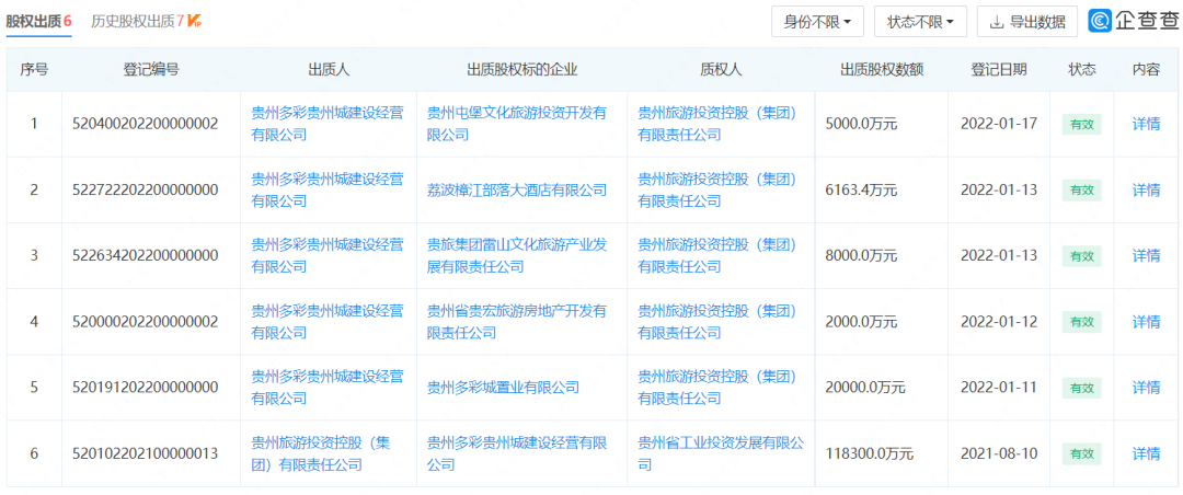或许是为缓解资金压力,信息显示,在2022年初,贵州多彩贵州城建设经营有限公司将其持有的包括贵州多彩城置业有限公司、贵州省贵宏旅游房地产开发有限责任公司、贵旅集团雷山文化旅游产业发展有限责任公司、荔波樟江部落大酒店有限公司和贵州屯堡文化旅游投资开发有限公司股权质押给贵州旅投集团。而紧随其后,旗下多家公司相继陷入债务困境。