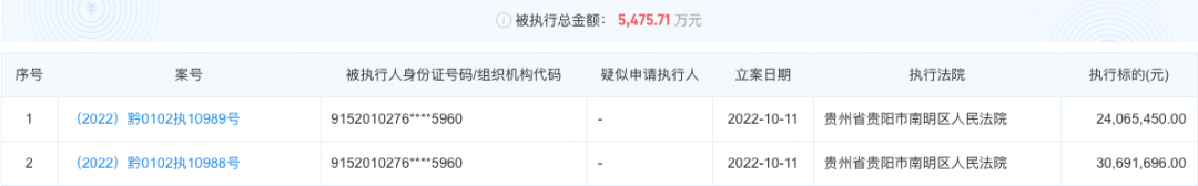 企查查显示,10月11日,贵州多彩贵州城建设经营有限公司新增两条被执行人信息(案号分别为(2022)黔0102执10989号、(2022)黔0102执10988号),被执行总金额为5475.71万元。