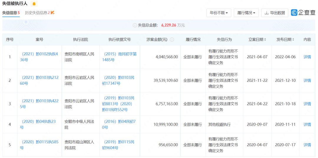 以文旅地产为主营业务之一,贵州旅投集团旗下遭遇困境的项目并非只有多彩贵州城。企查查显示,由贵州旅投集团持股22%的贵州美佳林城公园投资控股集团有限公司,目前已经有5条失信被执行人信息,失信被执行总额为6229.26万元,限消令13条,股权冻结信息5条,终本案件未履行总金额更是高达26531.43万,同时,旗下包括贵州国家公园旅行服务有限公司、贵州灵达房地产开发有限责任公司、荔波县鑫懋源房地产开发有限责任公司等在内的多家子公司均已深陷债务危机。