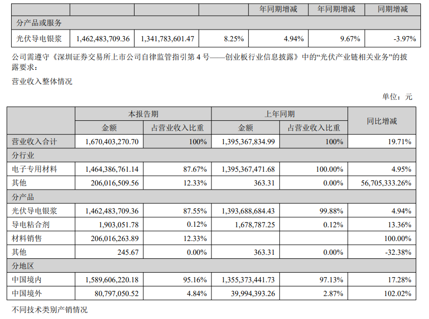 帝科股份半年报显示,2022年上半年,光伏导电银浆实现营收约14.62亿元,同比上升4.94%,占营业收入比重达87.55%。同期毛利率为8.25%,同比下滑3.97%。而2020年及2021年,光伏导电银浆的毛利率分别为13.3%、10.42%,2021年较2020年下滑了2.88个百分点。