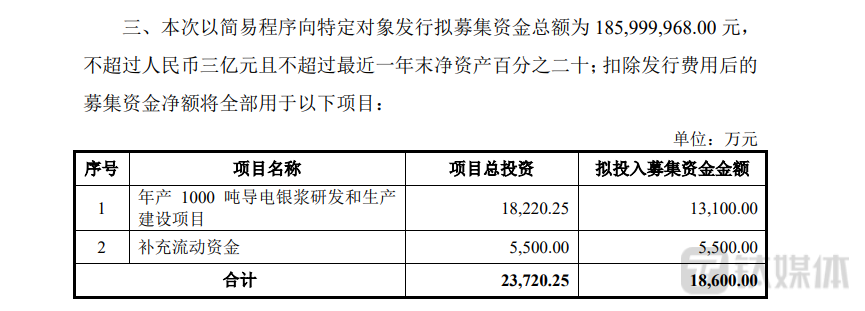 上市首发募投项目进度条还未拉满,帝科股份欲再融资募集约1.86亿元用于产能扩张,再度加码导电银浆。根据再融资募集说明书,本次募集资金中有1.31亿元用于年产1000吨导电银浆研发和生产建设项目,剩余5500万元用于补充流动资金。