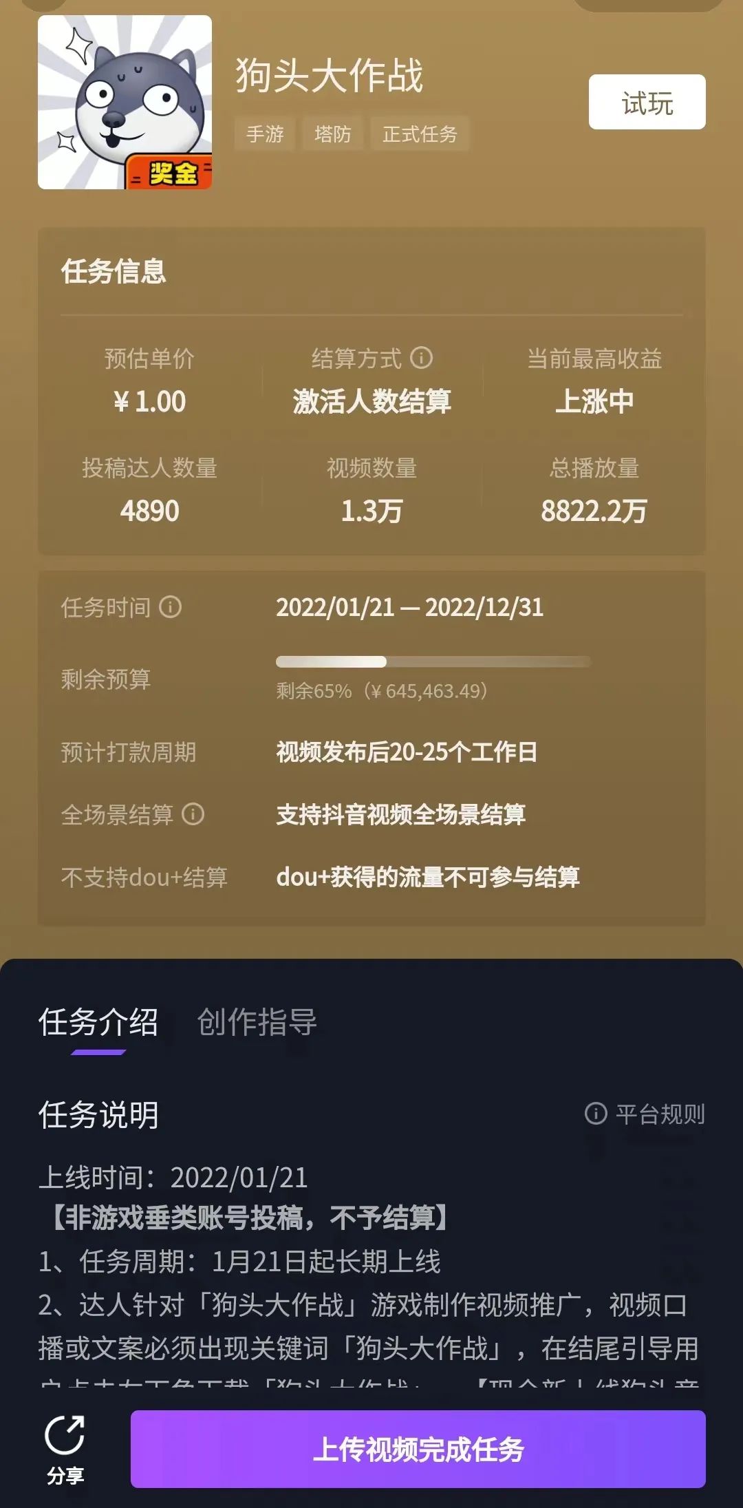 抖音数据显示:《狗头大作战》最新一期任务预估总预算达100万元,1月以来已消耗35%。这一消耗速度总体中等偏慢,原因在于该任务以1元的预估单价,大幅低于超休闲游戏买量CPA,并按照激活人数计算(一般按播放计价参与度高),导致参与投稿的达人数量并不算多。