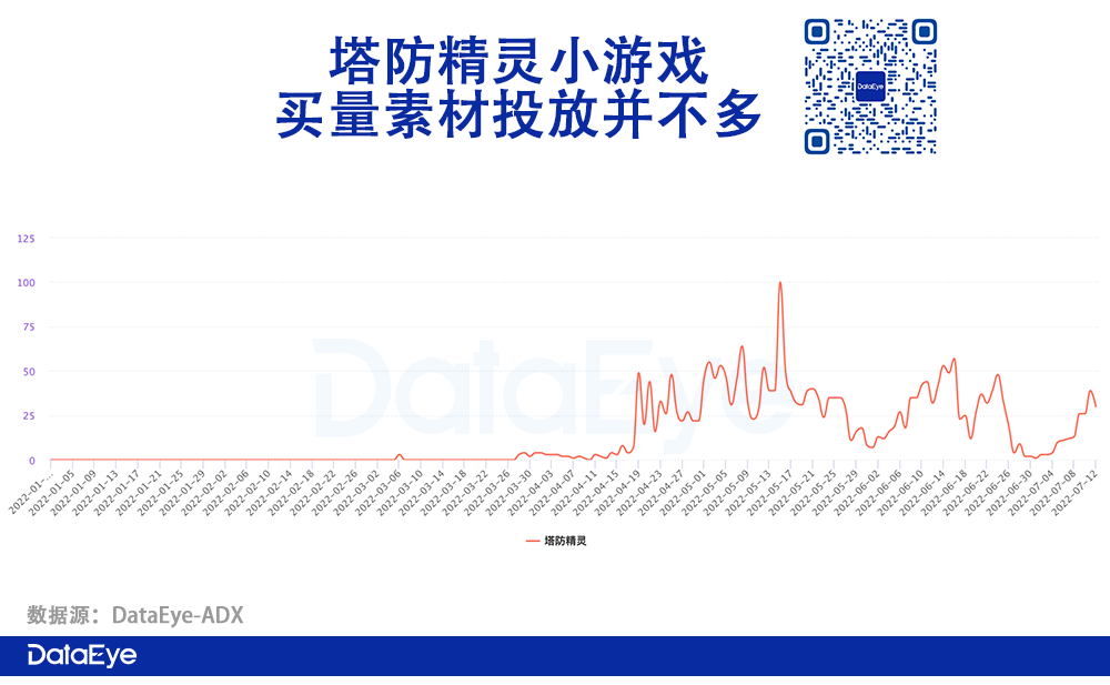 以时间节点来看,《塔防精灵》小游戏并没有针对市场关键节点进行加大买量投放,包括五一、端午以及即将到来的暑期档。