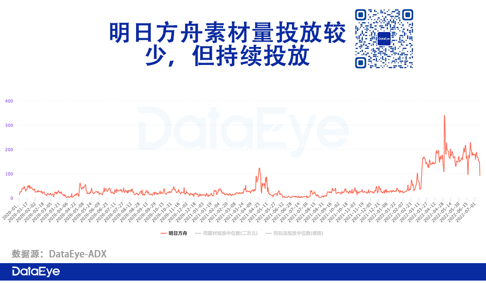 素材量方面,《明日方舟》一直维持低频、持续投入,仅在2022年才开始加大力度,但总体素材量并不多,是典型的二次元游戏“小而美、长线化”的思路。