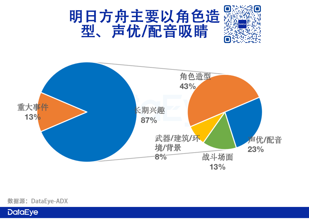 ·吸睛点:以【长期兴趣】原则为主,即简单直接地透过角色造型、声优/配音、战斗、武器、环境等元素展示美术能力。其次,辅之以【重大事件】原则,即高效素材往往都是介绍新角色、新活动上线。