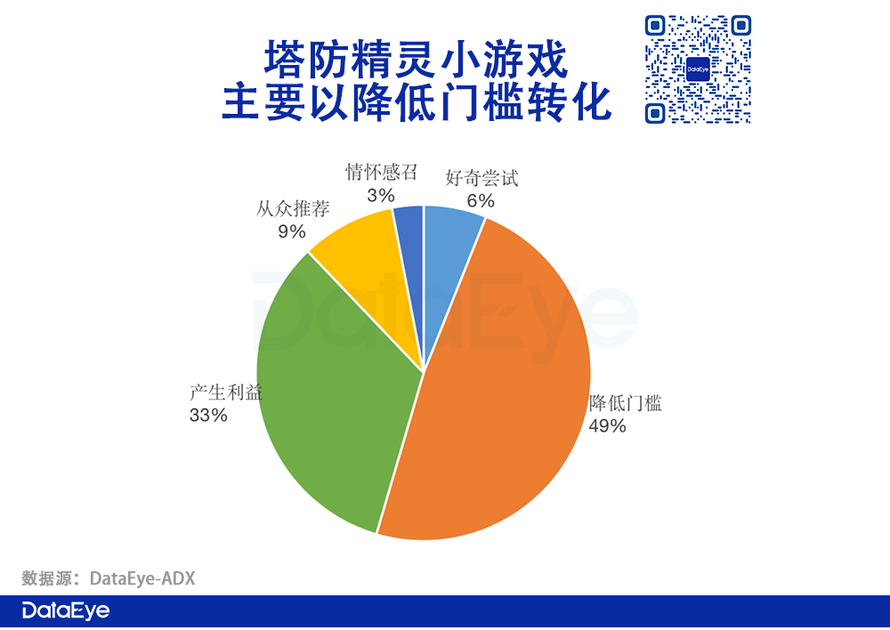 ·转化点:《塔防精灵》小游戏在转化点上侧重降低游戏门槛,或许因为基于小游戏产品,玩法相对简单,可以通过创意素材的内容讲解主要游戏玩法,使得更多目标用户在进入游戏前对游戏有基础的认知。