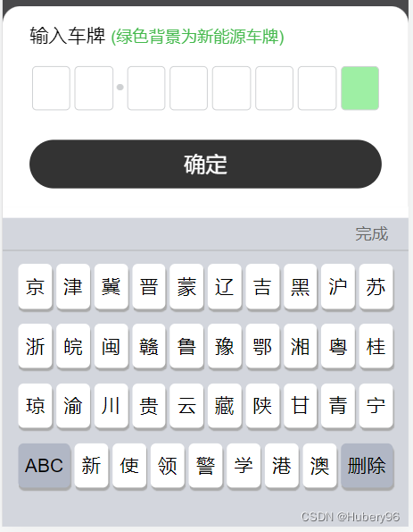 这个是组件的代码,直接在页面中引用即可,车牌号的值存在carNumber里面,在确定按钮中,讲完整的carNumber传到引用的页面中即可.