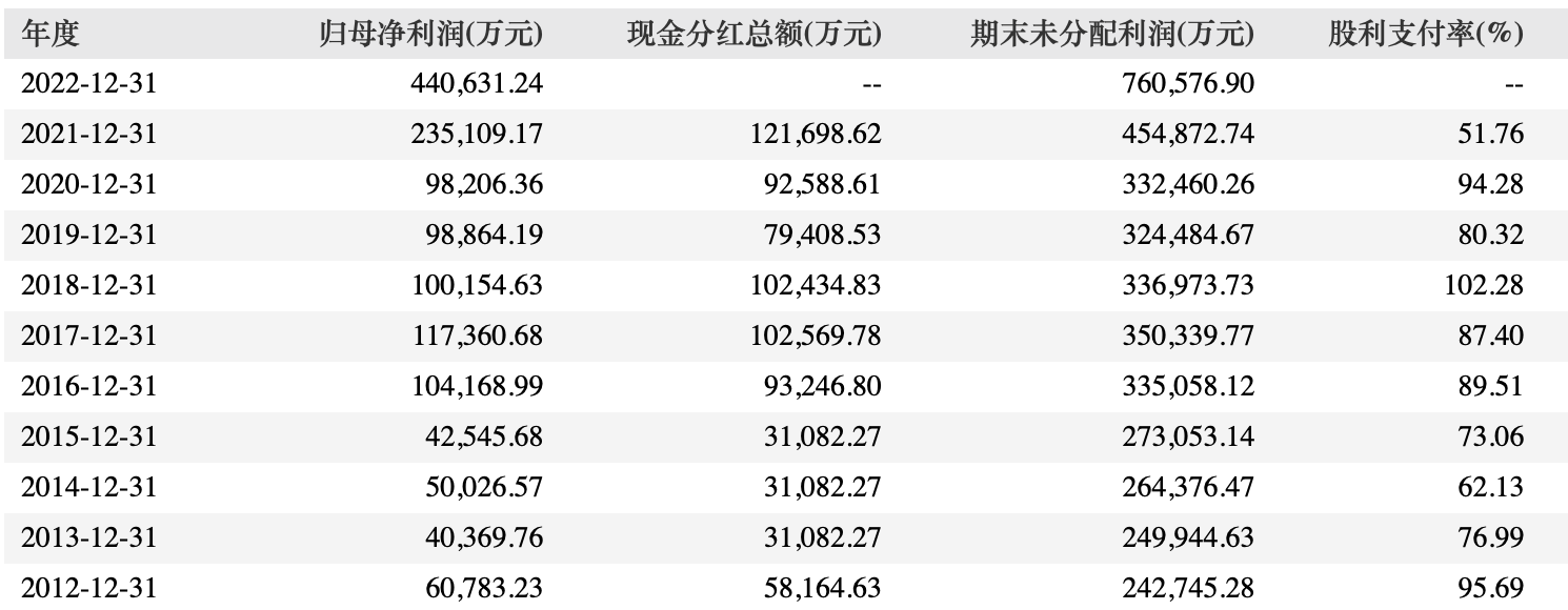 而历年分红数据显示,2012年以来,公司股利支付率都在50%以上且多数时候超过80%,2022年度的分红力度明显下降。