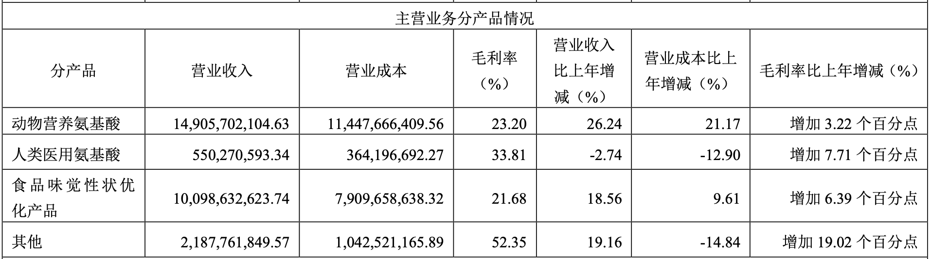 分产品来看,2022年动物营养氨基酸贡献收入149.06亿元,同比增长26.24%;食品味觉性状优化产品贡献收入100.99亿元,同比增长18.56%;其他产品贡献收入21.88亿元,同比增长19.16%;人类医用氨基酸贡献收入5.50亿元,同比减少2.74%。毛利率则分别为23.20%、21.68%、52.35%、33.81%,同比均录得增长。