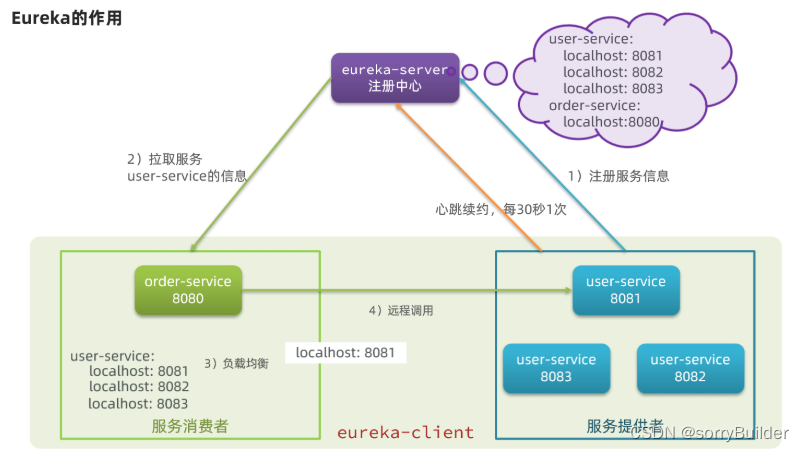 - user-service服务实例启动后,将自己的信息注册到eureka-server(Eureka服务端)。这个叫服务注册