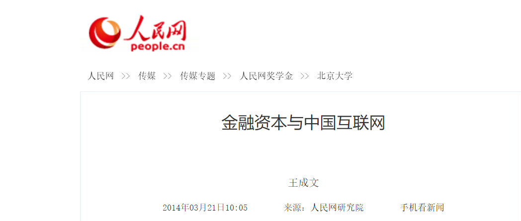 2014年3月,人民网研究院在《金融资本与中国互联网》中指出,金融资本所构筑的虚拟经济,是依托于实体经济的专业主义分工而产生的现代服务产业之一,是现代经济增长的重要推动力……同时,该文还特别强调,随着中国互联网与金融资本合作领域的不断丰富,金融资本的“副作用”也逐渐暴露……