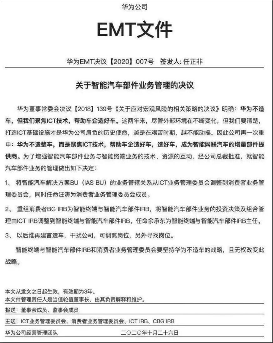 即便内部有多种主张,但随着华为创始人任正非签发了《关于智能汽车部件业务管理的决议》,也有了最终论断——即“三年内不造车”。