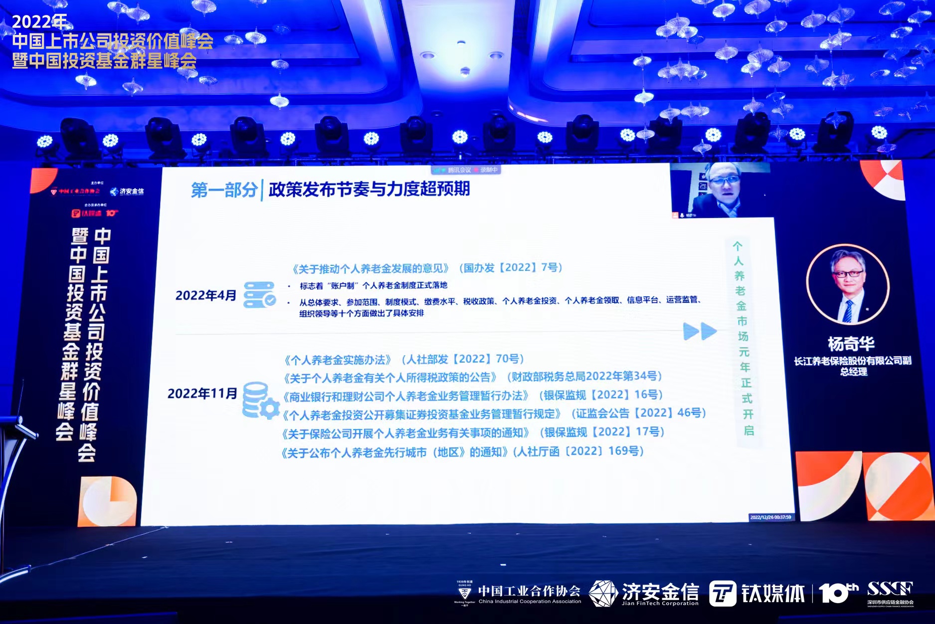 12月28日,在中国工业合作协会、济安金信、钛媒体联合举办的2022年中国上市公司投资价值峰会暨中国投资基金群星峰会上,长江养老保险股份有限公司副总经理杨奇华发表视频演讲。他表示,今年个人养老金政策发布的节奏和力度超出预期,市场热度超预期,开户数超千万。同时他也指出,个人养老金跟年金的基本属性是相同的,属于长期投资的养老金,都由市场化的机构投资,对于资金的安全性收益都有比较高的要求。因此,个人养老金的风险管控值得注意。