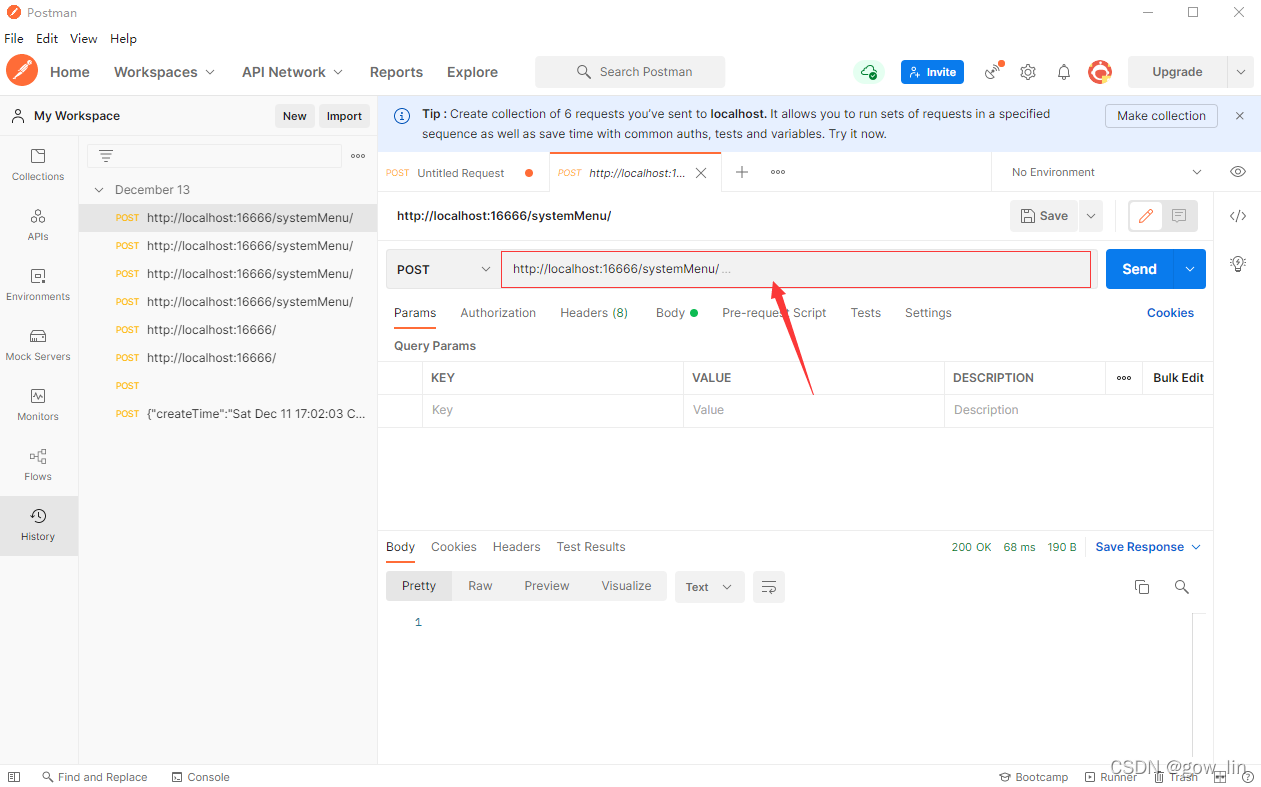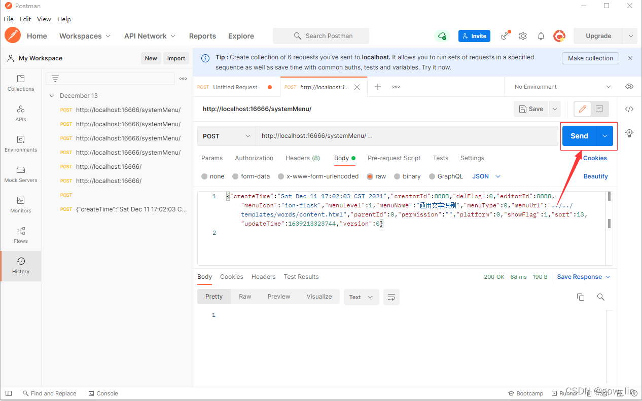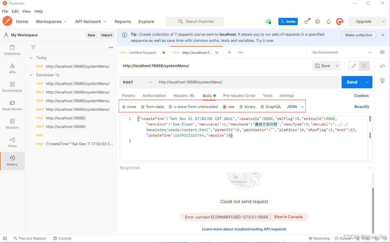 6.点击 body;选择body的格式。例如选择:raw/JSON;编写脚本;