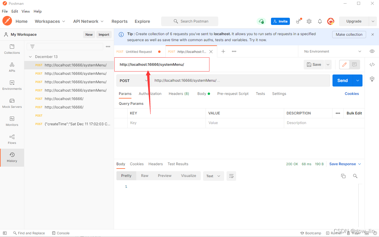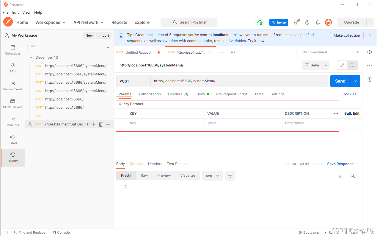 5.在 请求参数 处添加请求需要的参数(添加完之后参数会在URL栏处以key=value展示,多个参数以&连接;post请求一般不需要添加program、header等信息,但是在实际的企业级别是需要验证的,所以具体场景具体分析);