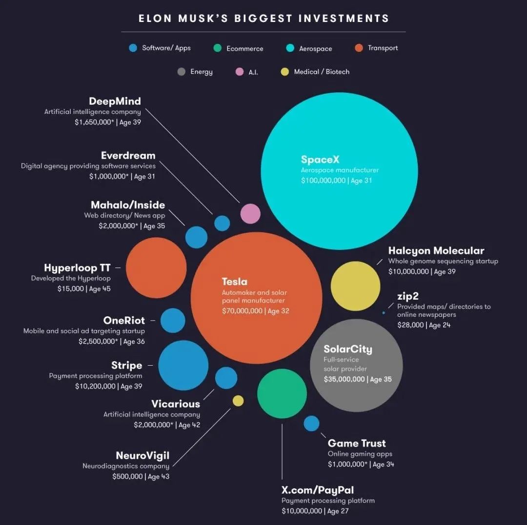 家用光伏发电项目公司SolarCity、脑机接口研究公司Neuralink、超级高铁Hyperloop、基础设施和隧道建设公司BoringCompany、人工智能研究组织Open ai,当然还有刚买下的世界移动社交网络巨头twitter,这些涉及众多科技领域,并且都是各自领域佼佼者的公司,它们共同组建了一艘未来航母,而马斯克必定是这艘母舰的掌舵者。