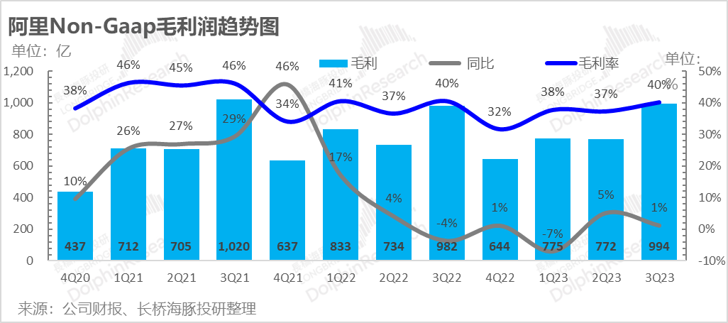 各亏损业务线目标一起看向自负盈亏,阿里毛利润在造血主力天猫淘宝拉胯的情况下,在维持住自身增长的同时,还跑出了相当不错的毛利表现。