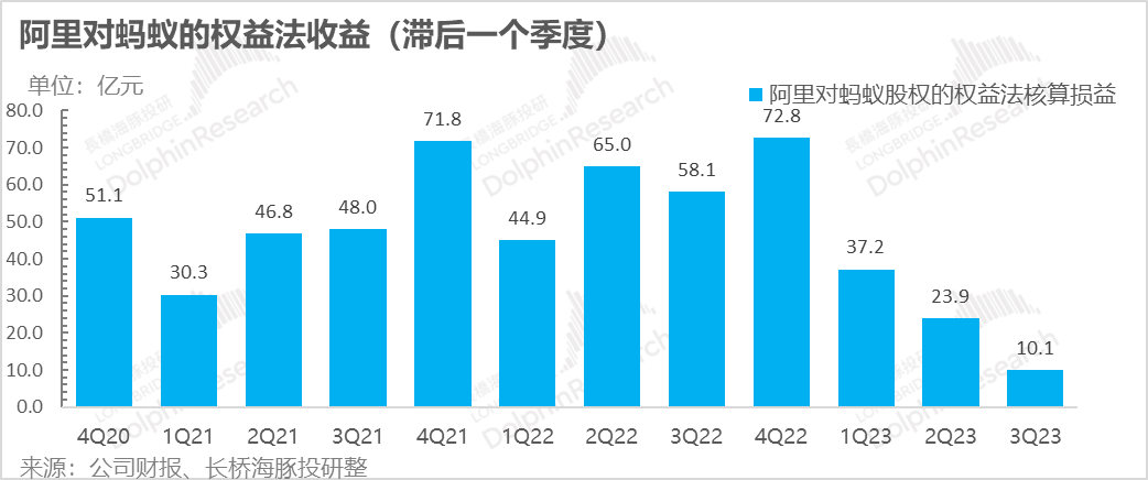 这个季度阿里计入来自于蚂蚁的权益法收益只剩10亿人民币,缩水严重。按照33%的股权占比,相当蚂蚁利润应该只有30亿,同比下滑了80%,缩水过于严重。实际利润虽然无法如此线性推算,但持续下滑的权益法收益占比,说明蚂蚁的情况依然很差。