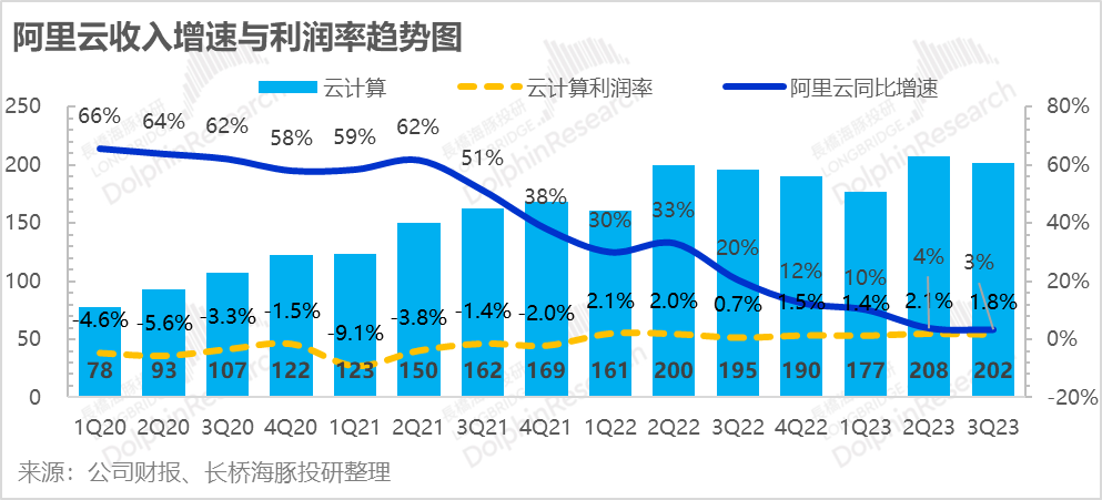 阿里云的增长仍在滑坡中,不过这个季度应该大概率增长底部已经确认。这个季度营收202亿,同比增长比上季度又掉了一个百分点,到了3%。