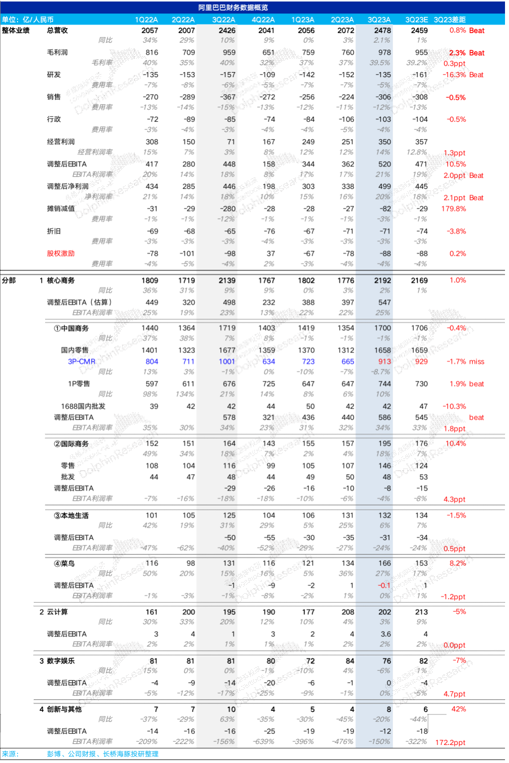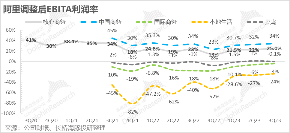 这样,在平台电商收入失血、利润掉血的情况下,靠着各个边线小兄弟们逐步一个个自食其力,保收入的同时改善亏损程度,最终在市场最为关注的利润指标——调整后EBITA利润上达到了520亿,远超出了市场预期的470亿。