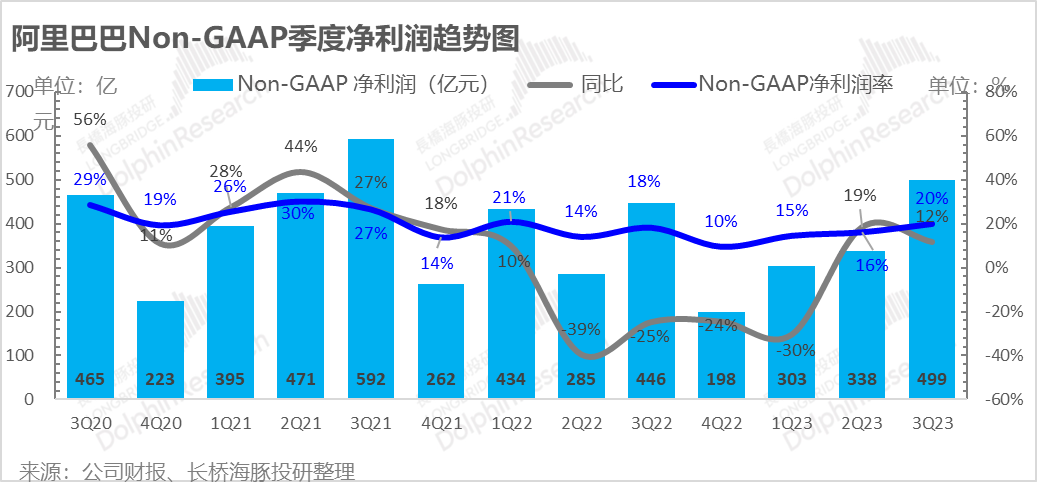 调整后净利润499亿,同样大幅超出市场预期445亿;在收入增速仅有2%的情况下,通过各种降本增效,在四季度这种极致极端的经营环境下,把利润增速做到了12%,利润率达到了20%,超去年同期的18%。