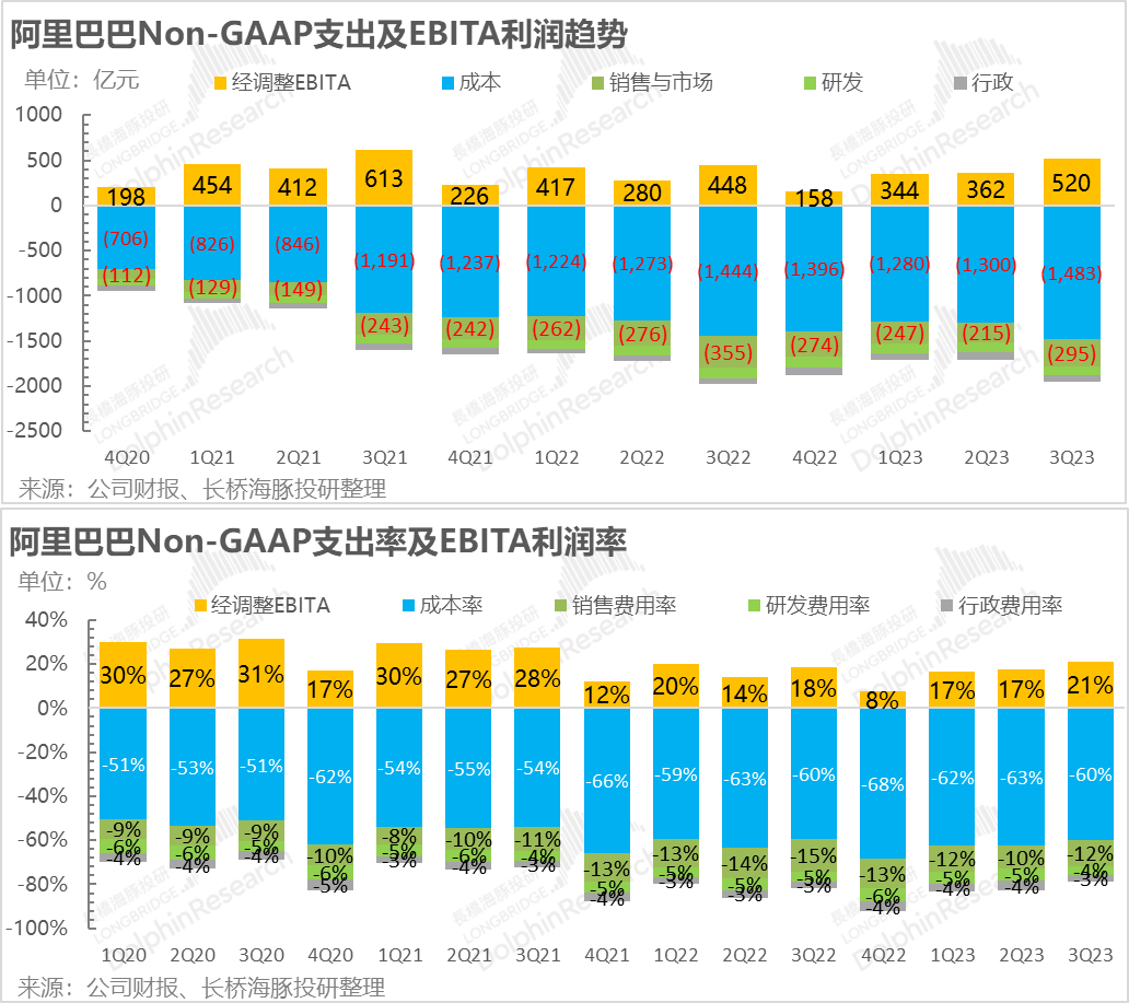 在费用上,阿里仍在拼命节省,研发同比、环比突降尤其醒目: