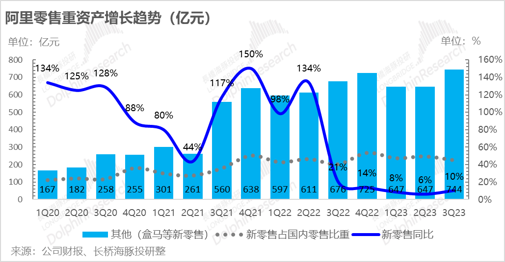 这个季度重资产零售业务收入达到了 744亿,同比增长回归到了10%以上,超出了市场预期的730亿人民币。