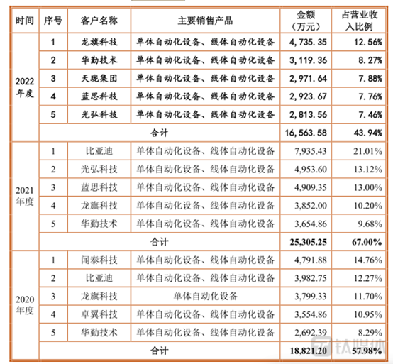 从客户上看,鑫信腾的业绩还较为依赖公司的前五大客户。报告期内,鑫信腾向前五大客户产生的销售收入分别为18821.2万元、25305.25万元、16563.58万元,分别占当期营业收入的57.98%、67%、43.94%,具体如下: