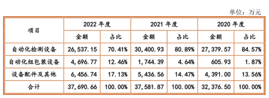 钛媒体APP注意到,导致鑫信腾业绩呈现上述情况的主要因为或许是因为第一大业务停滞不前所致。鑫信腾主要拥有自动化检测设备、自动化组包装设备、设备配件及其他,其中报告期内,自动化检测设备产生的销售收入分别为27379.57万元、30400.93万元、26537.15万元,分别占当期主营业务收入额84.57%、80.89%、70.41%,为公司的第一大业务。从金额上看,2022年自动化检测设备产生的销售收入是近三年中最低的。面对业绩增速不高、主业停滞不前,鑫信腾如何能保持公司的成长性?