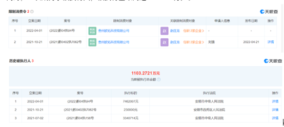 更加令人不可思议的是,天眼查显示,2021年和2022年,欧拓科技先后两次被限制消费。同时,三次成为了被执行人,被执行金额高达1103.27万元。