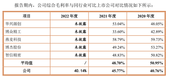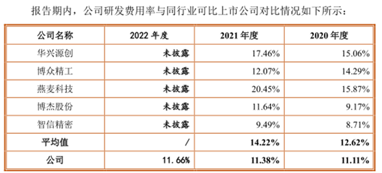 除此之外,鑫信腾产品的竞争力还始终弱于同行可比公司。2020年-2021年,鑫信腾的毛利率分别为40.76%、45.77%,同行可比公司均值分别为50.95%、48.7%,始终低于同行均值。值得一提的是,导致上述现象产生的主要因素或是因为公司在研发投入较低。2020年-2021年,鑫信腾的研发费用率分别为11.11%、11.38%,同行可比公司均值分别为12.62%、14.22%。