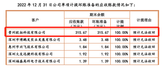 除此之外,鑫信腾还有一起交易值得令人商榷。2022年末,鑫信腾对贵州欧拓科技有限公司(下称“欧拓科技”)的应收账款全部计提了坏账准备。
