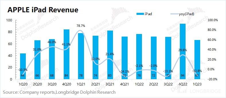 2023 财年第二季度 iPad 业务收入 67 亿美元,同比下滑 12.8%,符合彭博一致预期(66.8 亿美元)。iPad 的市场需求和 Mac 整体相近,当在家办公等需求退却,对于 iPad 的需求也回落至平稳水平。