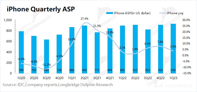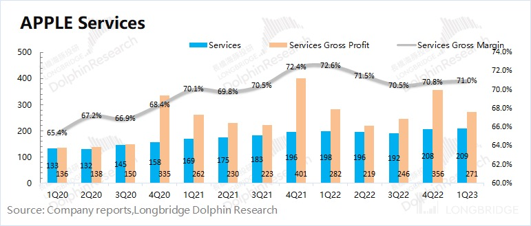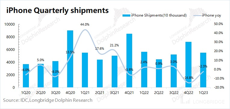 1)iPhone 出货量:在本季财报披露前,IDC 已经对季度各品牌出货情况做了披露。受疫情、通胀等因素影响,2023 年第一季度全球智能手机市场同比下降 14.6%。凭借自身的产品力,苹果公司的市场份额继续从 18% 提升至 20.5%。公司本季度出货量仅下滑 2.3%,明显优于行业水平;
