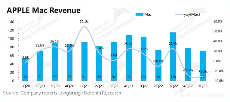 2023 财年第二季度 Mac 业务收入 72 亿美元,同比下滑 31.3%,大幅低于彭博一致预期(79 亿美元)。Mac 业务本季度的大幅下滑,主要是受行业需求疲软所致。