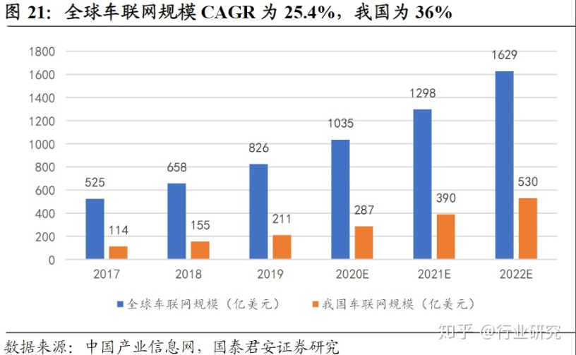 中国车联网市场规模将从2017年114亿美元增长至2022年530亿美元,2019-2022年占全球份额由26.0%提升到32.5%,CAGR为36%,高于全球增速。