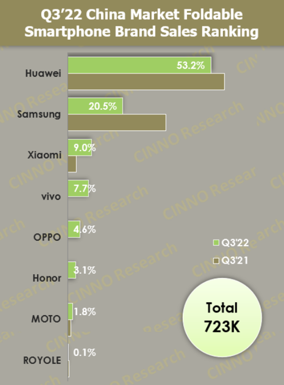 市场表现也印证了华为折叠屏手机的实力,根据CINNO Research公布的第三季度中国折叠屏手机市场数据,华为折叠屏手机销量同比增长95%,占据了中国折叠屏手机市场53.2%的市场份额,蝉联今年Q1-Q3三季度国内折叠手机单季销量冠军。