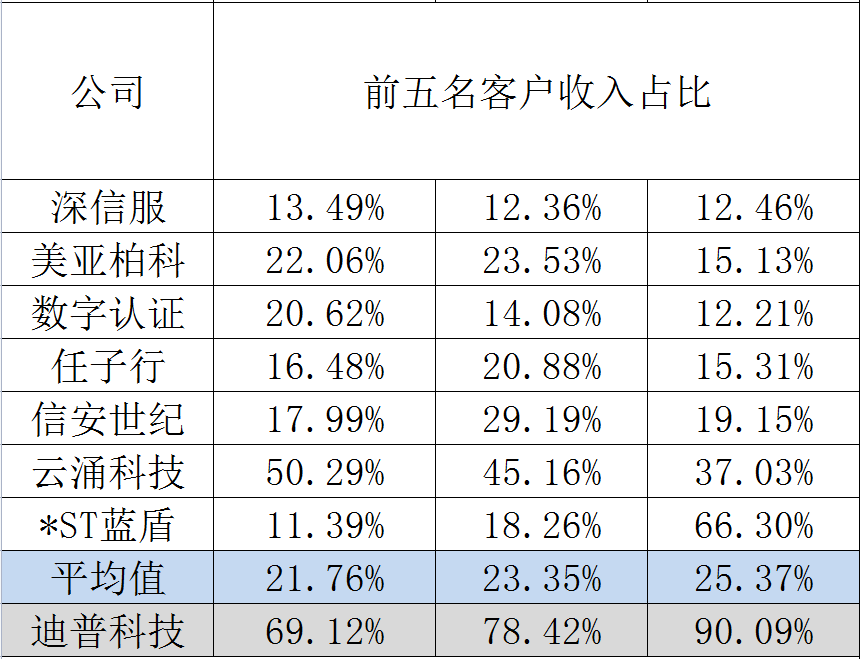 钛媒体APP发现迪普科技前五名客户收入占比在2019年、2020年、2021年分别为69.12%、78.42%、90.09%, 连续三年持续上涨,行业平均值近三年分别为27.68%、30.24%、33.46%,迪普科技较行业平均值分别高出41.44%、48.18%、56.63%,存在客户集中度较高的情况。有业内人士表示,迪普科技对大客户的依赖性极高,可能会对公司的生产经营产生不利影响,一方面,如果部分客户经营情况不利,或降低对公司产品的采购,公司的营业收入增长将受到较大影响;另一方面,客户集中度过高对公司的议价能力也存在一定的不利影响,那么公司未来业绩将面临较大不确定性。
