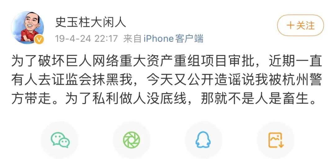 期间,网上还有传闻称史玉柱被杭州警方带走,史玉柱再发微博称,“为了破坏巨人网络重大资产重组项目审批,近期一直有人去证监会抹黑我,今天又公开造谣说我被杭州警方带走。为了私利做人没底线,那就不是人是畜生。”