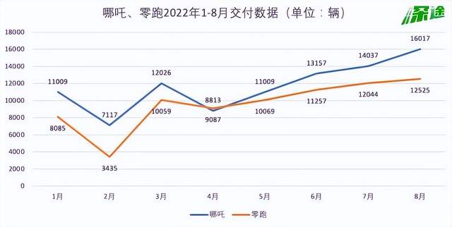 8月份造车新势力的表现中,头部基本延续了7月的态势。哪吒和零跑分别以16017辆、12525辆的成绩位列第一、第二,和7月份一样,双双再次交出史上最好成绩。