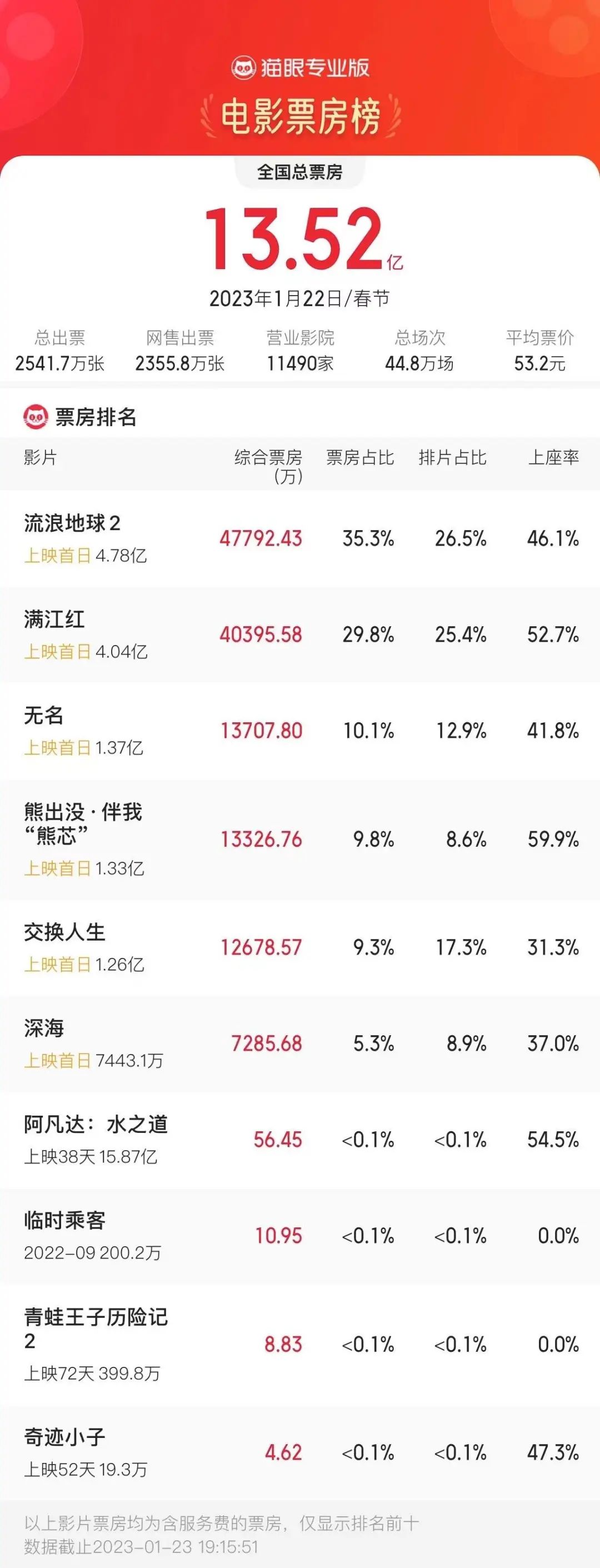 据镜象娱乐统计,今年初一上映的6部影片中有4部片长在2小时以上,平均片长近130分钟,而在2022年,春节档影片的平均片长为108分钟,2021年则是121分钟。且在今年,《流浪地球2》《满江红》“双雄”在大年初一合计占据52%的排片,两部影片也是今年春节档最长的影片,前者片长达到173分钟,后者也在159分钟。从这个角度来说,今年春节档能在大年初一拿下13.52亿票房已经非常可观。