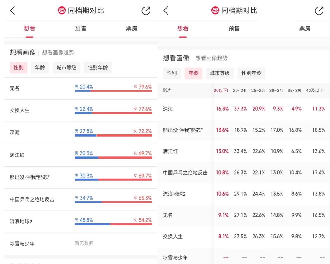 反映到消费群体分布表现上,猫眼想看画像数据显示,《流浪地球2》的用户性别分布相对均匀,《无名》《交换人生》《深海》的女性消费群占比都在7成以上。而在年龄方面,《熊出没·伴我“熊芯”》呈现出明显的亲子消费属性,30岁以上消费群体合计占比52.3%;《深海》《满江红》更受年轻市场的欢迎,24岁以下群体合计占比都在50%左右……由此可见,多元题材能够更好地驱动差异化观影群体走进影院。